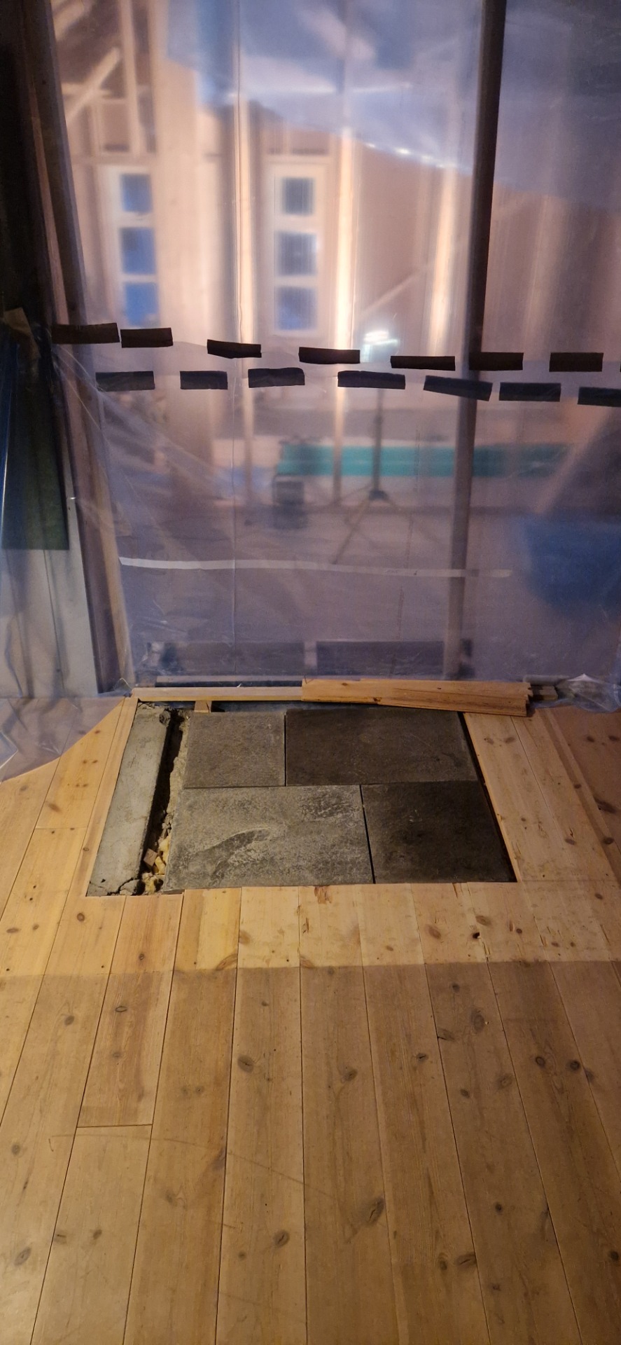 Ovnen ble flyttet og fundamentet for den gamle peisen ble revet ned til armert støp. Den støpte platen er nå isolert og forblendet med gipsplater på undersiden.
