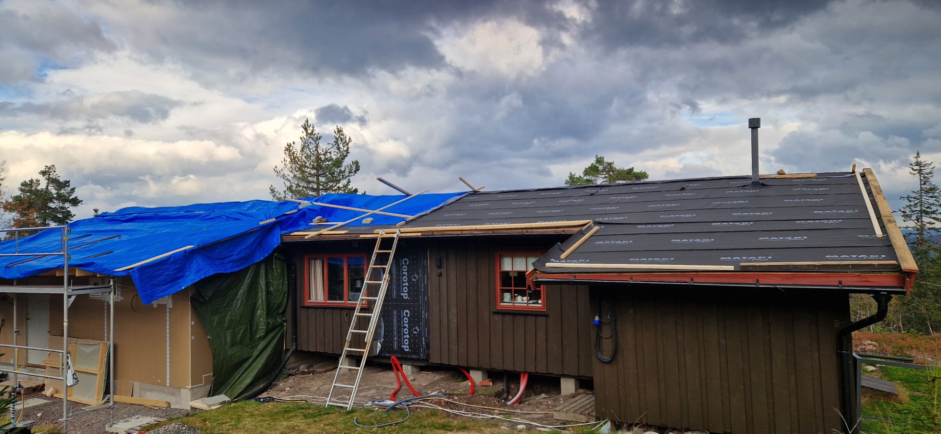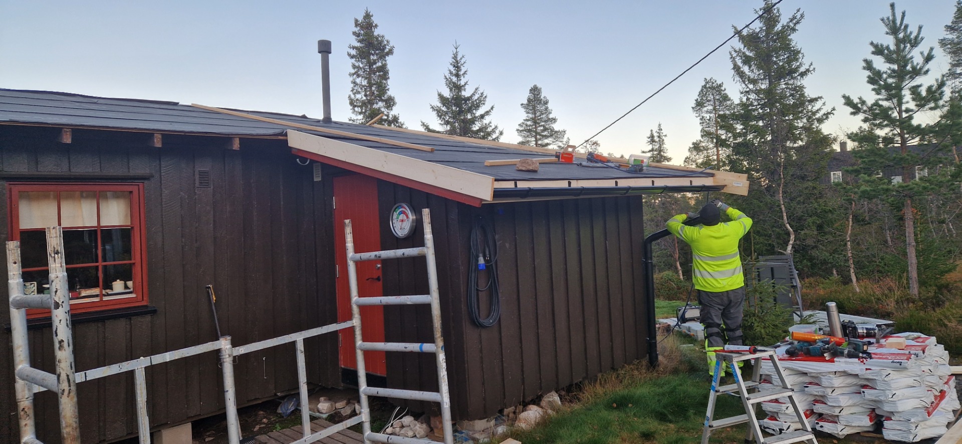 Finværsdag med jobb på alle tak. Anders Lande tekker tilbygget, mens Blefjell Hytteservice jobber med taket på gamlehytta.