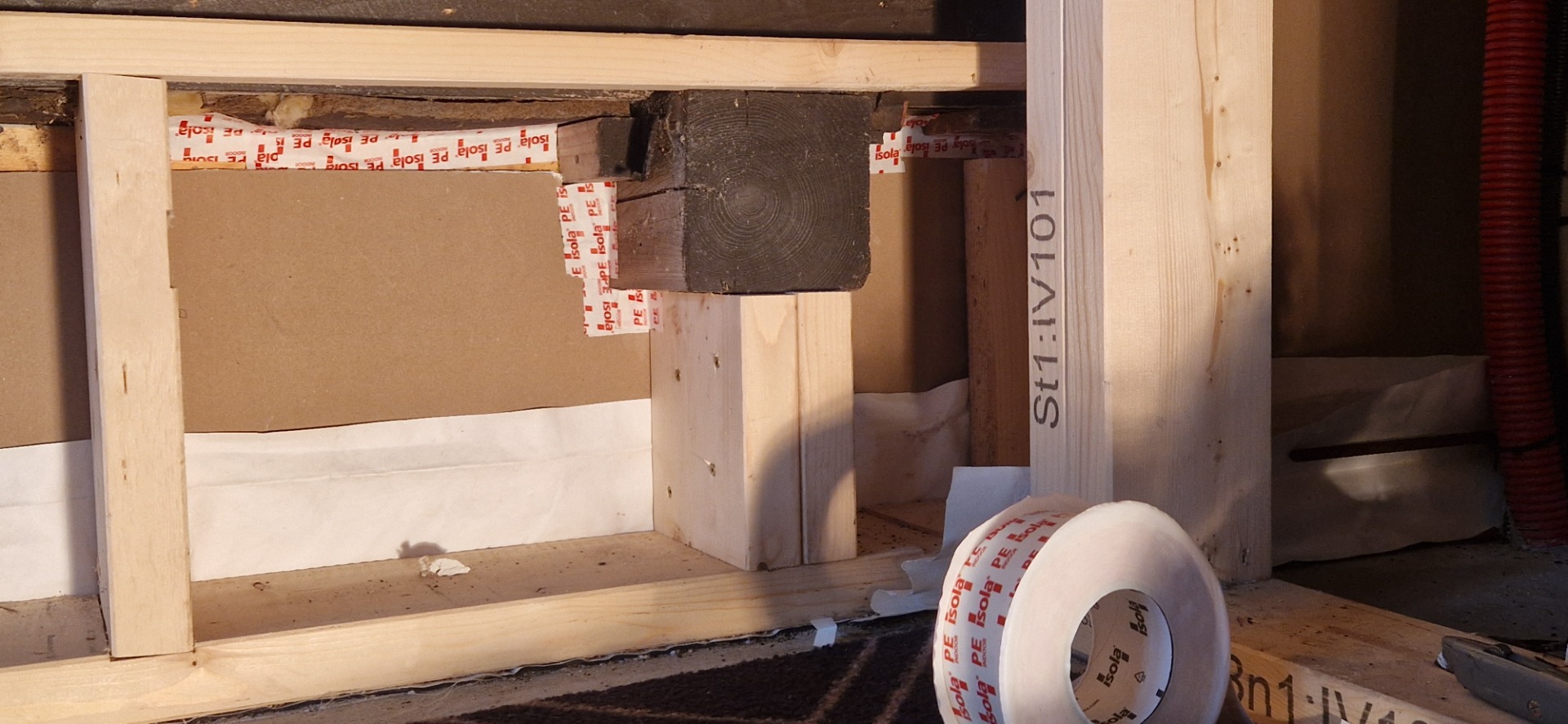 Noen timer i dag er gått med til taping av skjøter og sprekker mellom nytt og gammelt, dels i tilbygget og dels under hytta.