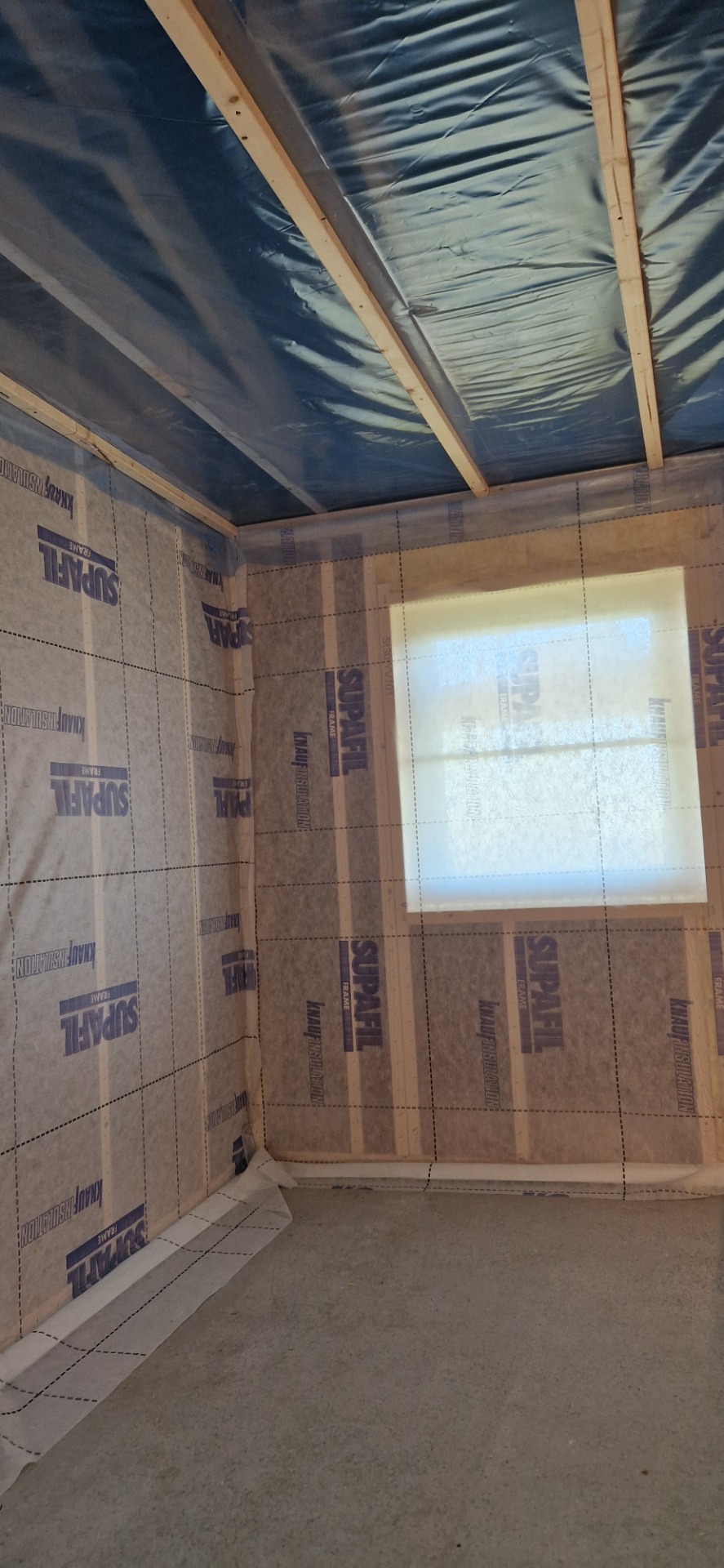 Nå har jeg duket for blåsing av isolasjon. Litt jobb med blåseduken, som skal på alle vegger og skråhimling. Kaldt loft blåses med løs isolasjon direkte på dampsperren.
