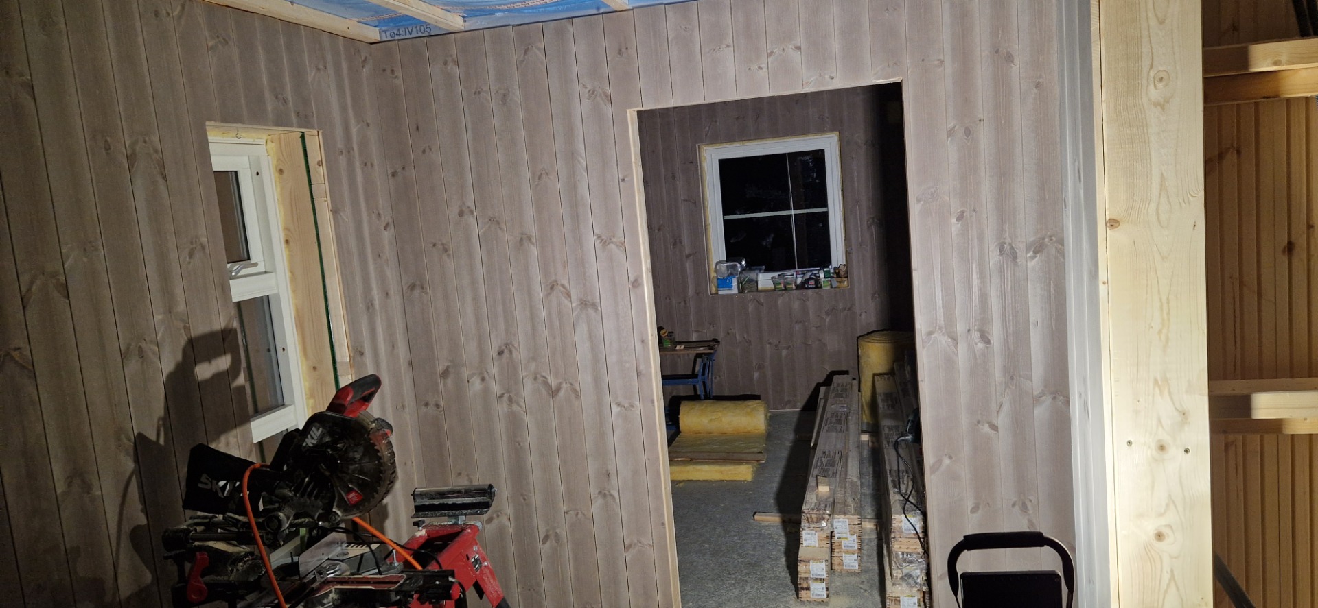 Det store lasset med panel som fyller hele tilbygget krymper sakte, etter hvert som kledningen flytter seg fra gulv til vegg og himling